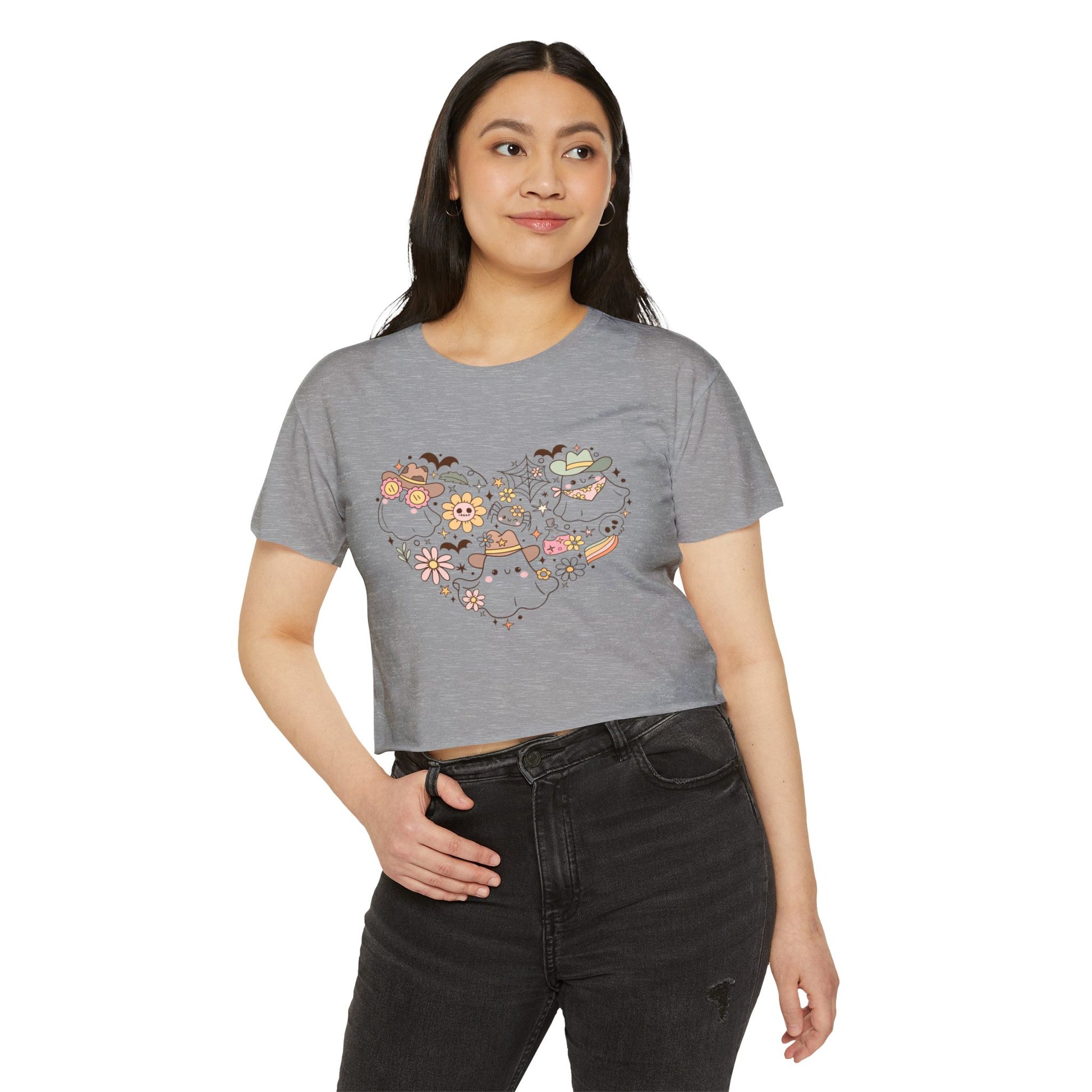 Women's crop Top with Floral Ghost Design, Summer T-Shirt, Boho Style Top, Festival Wear, Cute Casual Summer Shirt